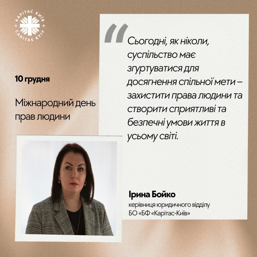 «Загальна декларація прав людини є видатним документом в історії людства. Цим документом закріплено, що права людини – це невід’ємний елемент людської собистості та людського буття. Процес формування прав людини пройшов довгий шлях свого розвитку, тісно пов’язаний з історією розвитку суспільства. Загальною декларацією прав людини започатковано процес створення системи міжнародних стандартів у галузі прав людини, набуття ними універсального характеру», – зазначила Ірина Бойко, керівниця юридичного відділу «БФ «Карітас-Київ».