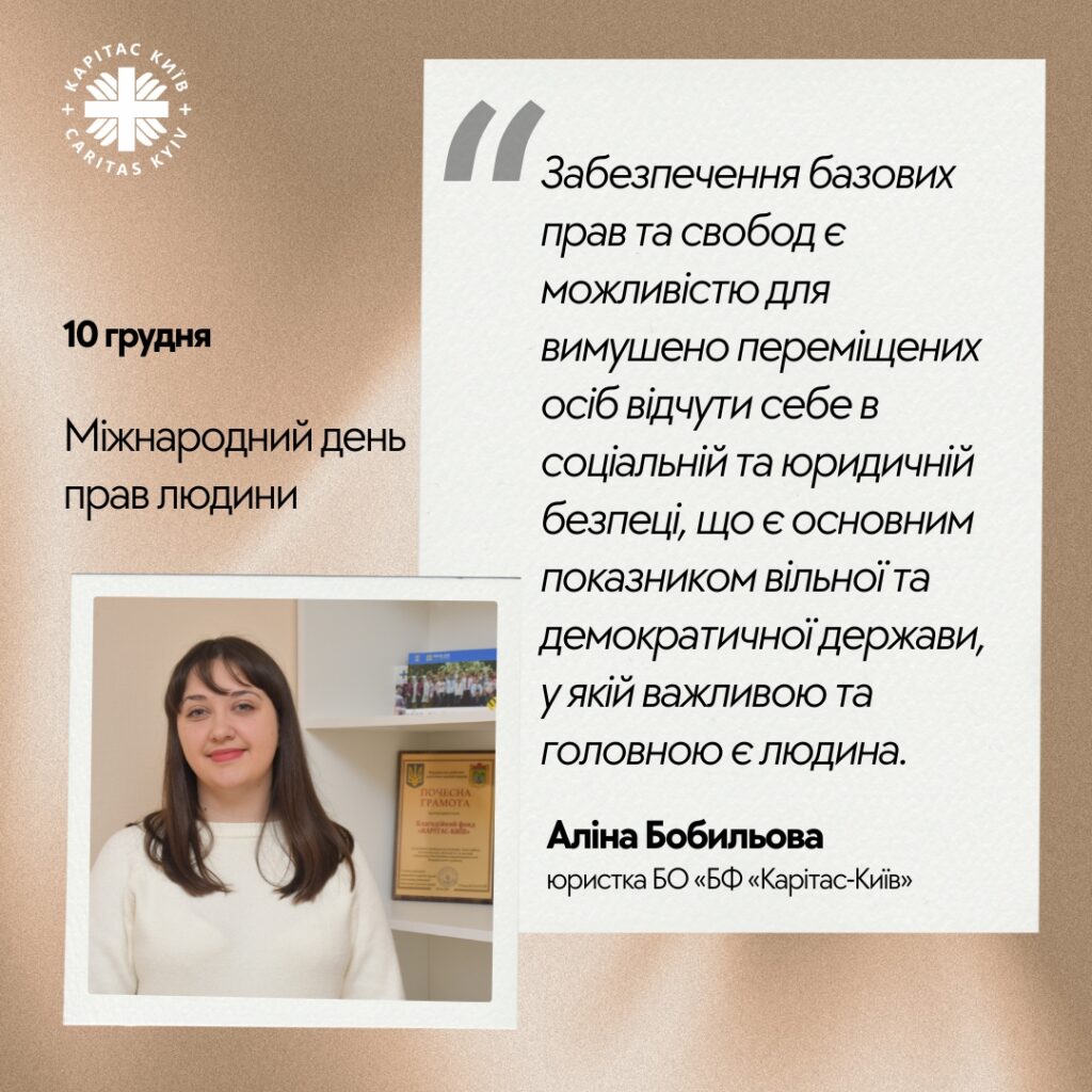 «Актуальною проблемою сьогодення є захист прав внутрішньо переміщених осіб, оскільки ця категорія громадян України відноситься до однієї із найвразливіших. Тому забезпечення базових прав та свобод, які визначені Загальною декларацією прав людини, гарантує не тільки стандартні принципи міжнародного права, а й надає можливість вимушено переміщеним особам відчути себе в соціальній та юридичній безпеці, що є основним показником вільної та демократичної держави де важливою та головною є людина»,– зазначає Аліна Бобильова, юристка БО «БФ «Карітас-Київ».